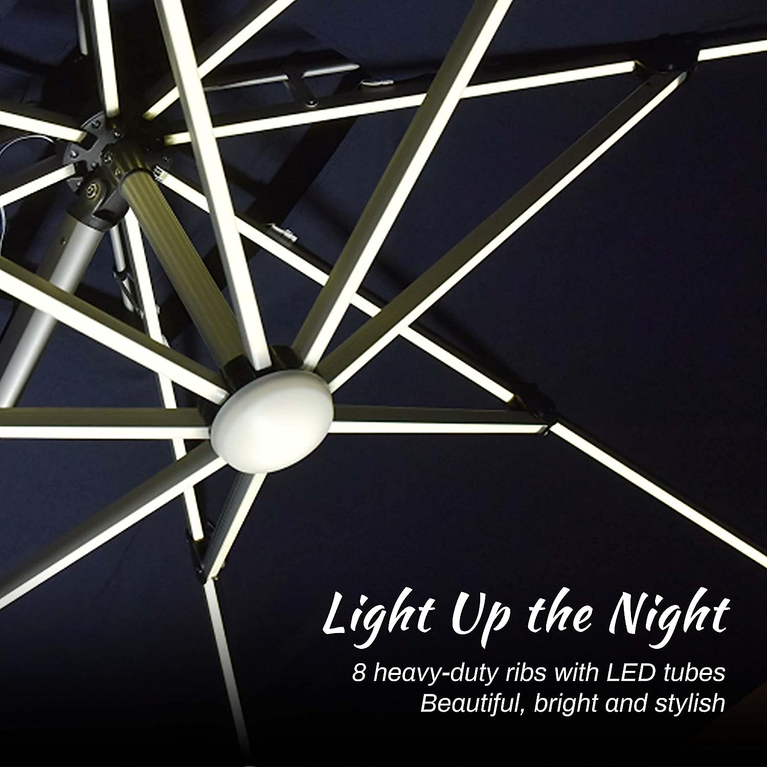 - All-aluminum umbrella bones and 8 HEAVY-DUTY RIBS with LED LIGHT TUBES. anti-oxidation spray painted. maintain a long period life
