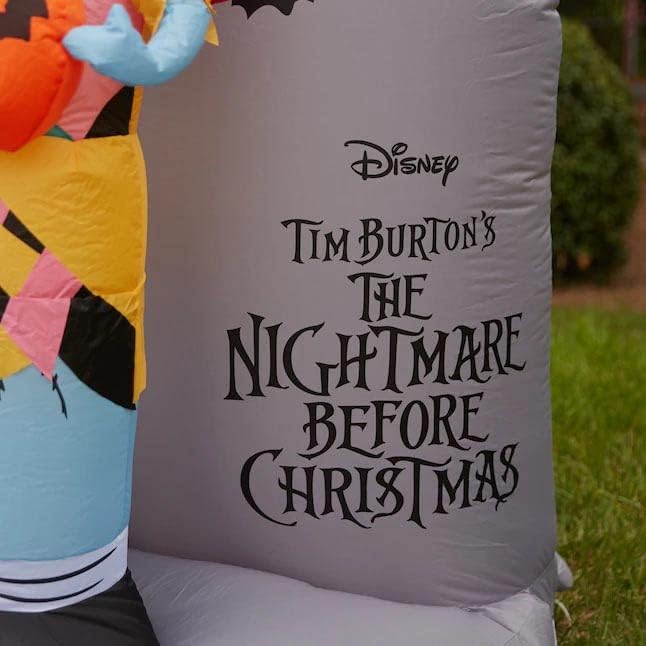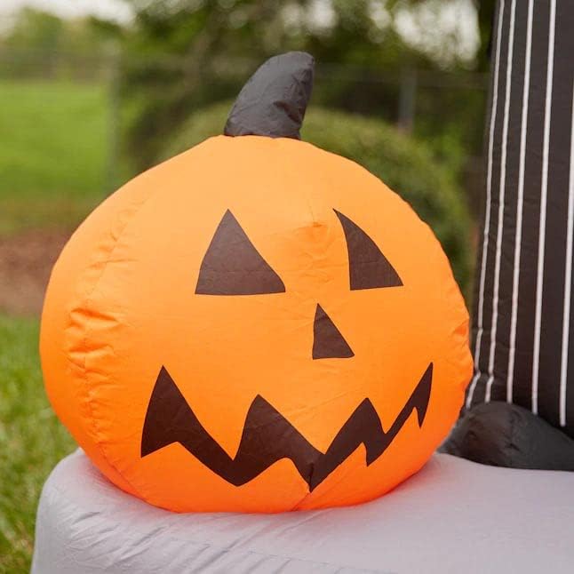 Gemmy Airblown Inflatable Tim Burton's Nightmare Before Christmas Jack Skellington and Sally Mountain Scene w/ Pumpkins! 7' Tall x Over 5' Wide x Over 4' Deep! Show your Halloween spirit with this Scary Nightmare Before Christmas Airblown Inflatable! This Gemmy Airblown inflatable blows up in minutes with a Heavy Duty internal Fan. This Airblown Inflatable must remain plugged in to stay inflated. It comes with everything you need for a glowing nighttime display that will be the talk of the neighborhood! Made from light weight durable nylon. Comes with a Heavy Duty internal fan. internal C7 5watt lights. ropes. and stakes. Easy assembly! Made for indoor or outdoor use!