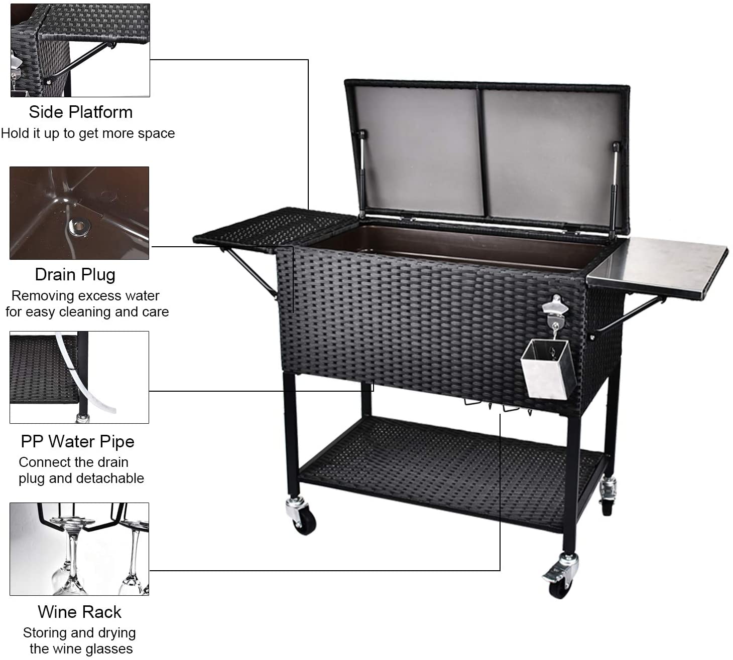 - 【Convenient Features】 – Built-in bottle opener. drain plug removing excess water. for easy cleaning and care. the frame has the setting of fixed water pipe. A durable thick oxford waterproof cover is also given as a gift. which protects your cooler cart damage from rain. sun. snow. dust. dirty. leaves. etc. Comes with detailed instructions. all the needed hardware and tool. are included. super easy to assemble