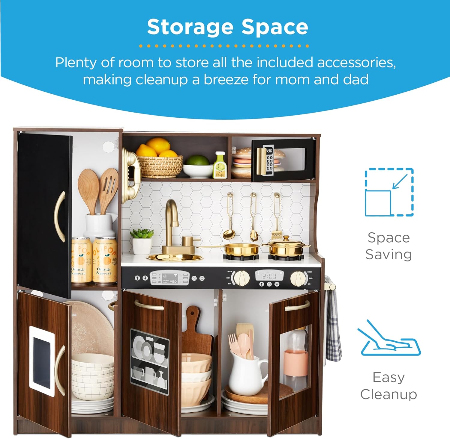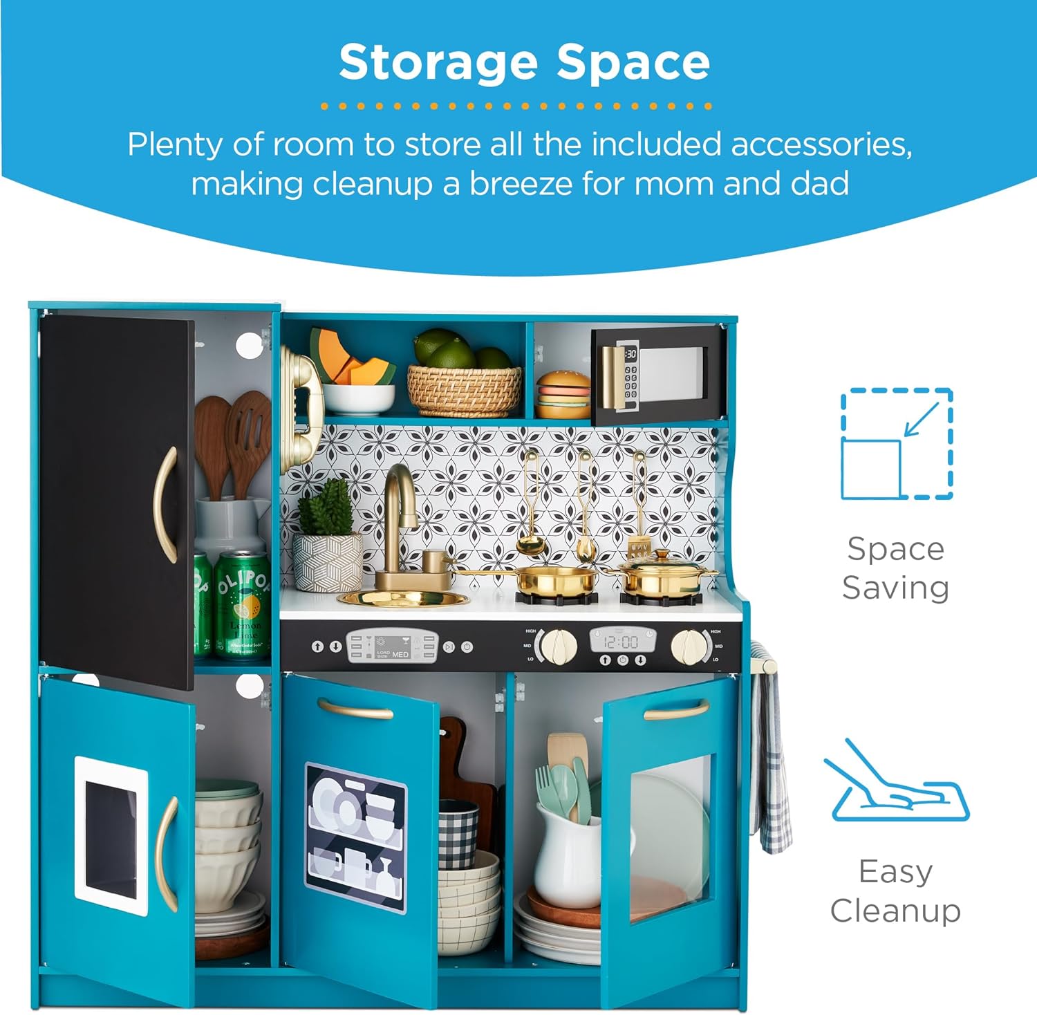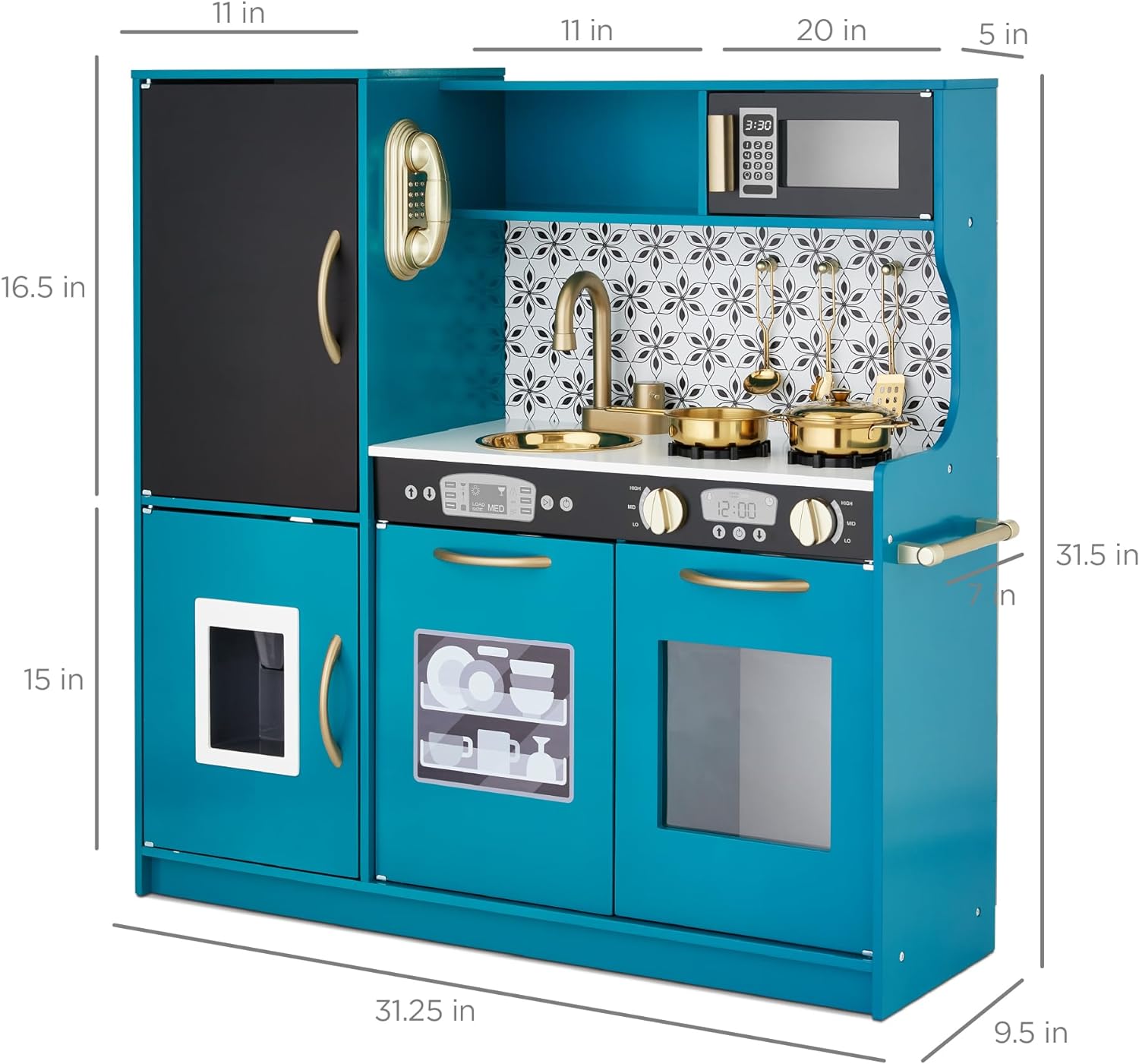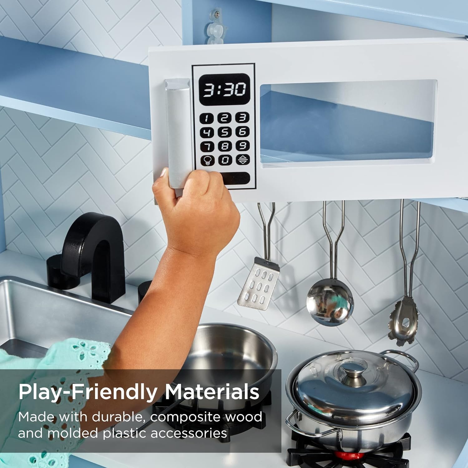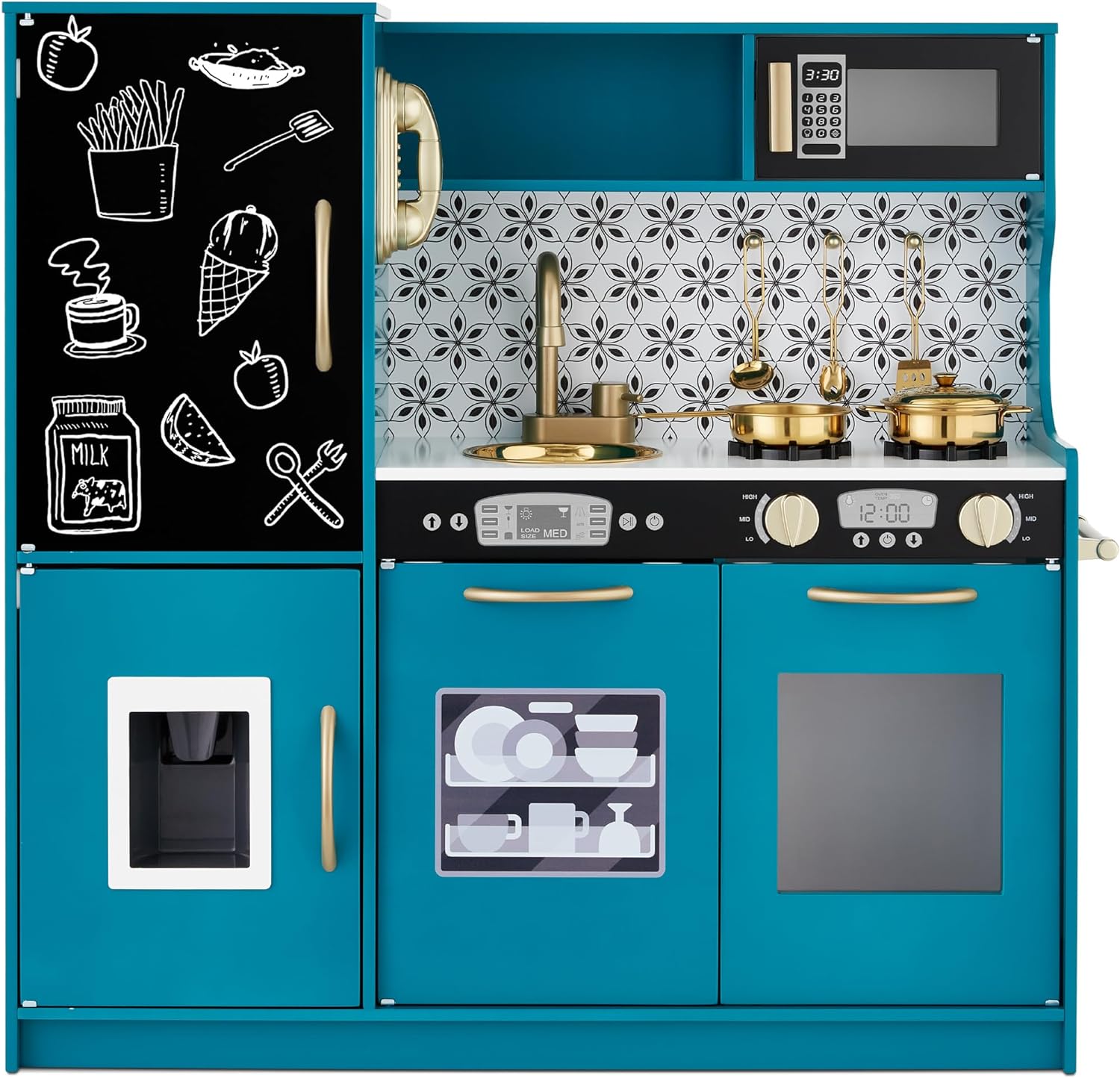 - CHALKBOARD SURFACE: Little chefs can jot down notes on the included chalkboard surface as they play grownup all day with this large set made with a realistic design that mimics a real kitchen. designed for their size. and have fun playing with the ice maker. microwave. phone. and other fun features