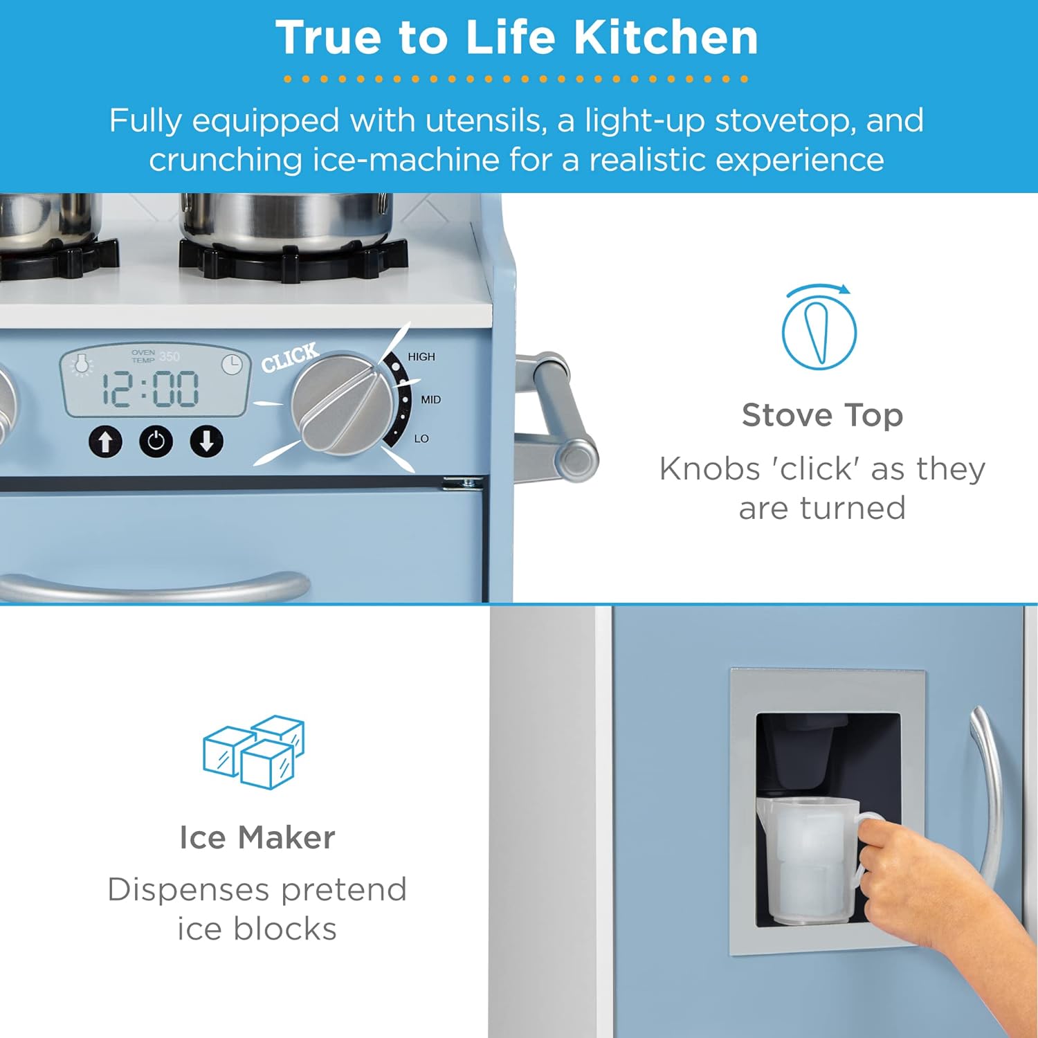 - TRUE TO LIFE KITCHEN: Your child can get a true experience with fun features like a towel rack and ice machine. and realistic sounds like the "click" of the oven knobs as they pretend to bake and cook in a stylishly designed kitchen with a backsplash for a modern appeal