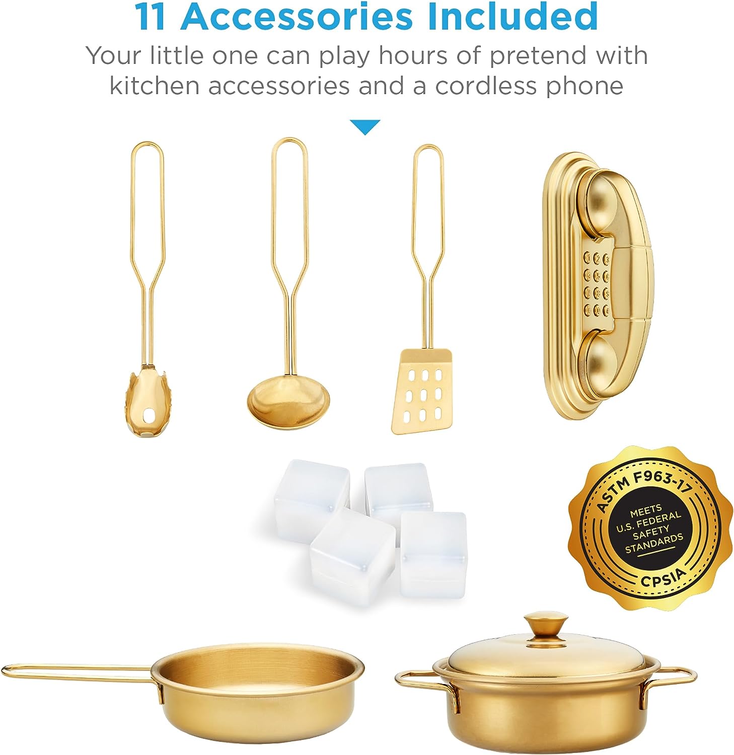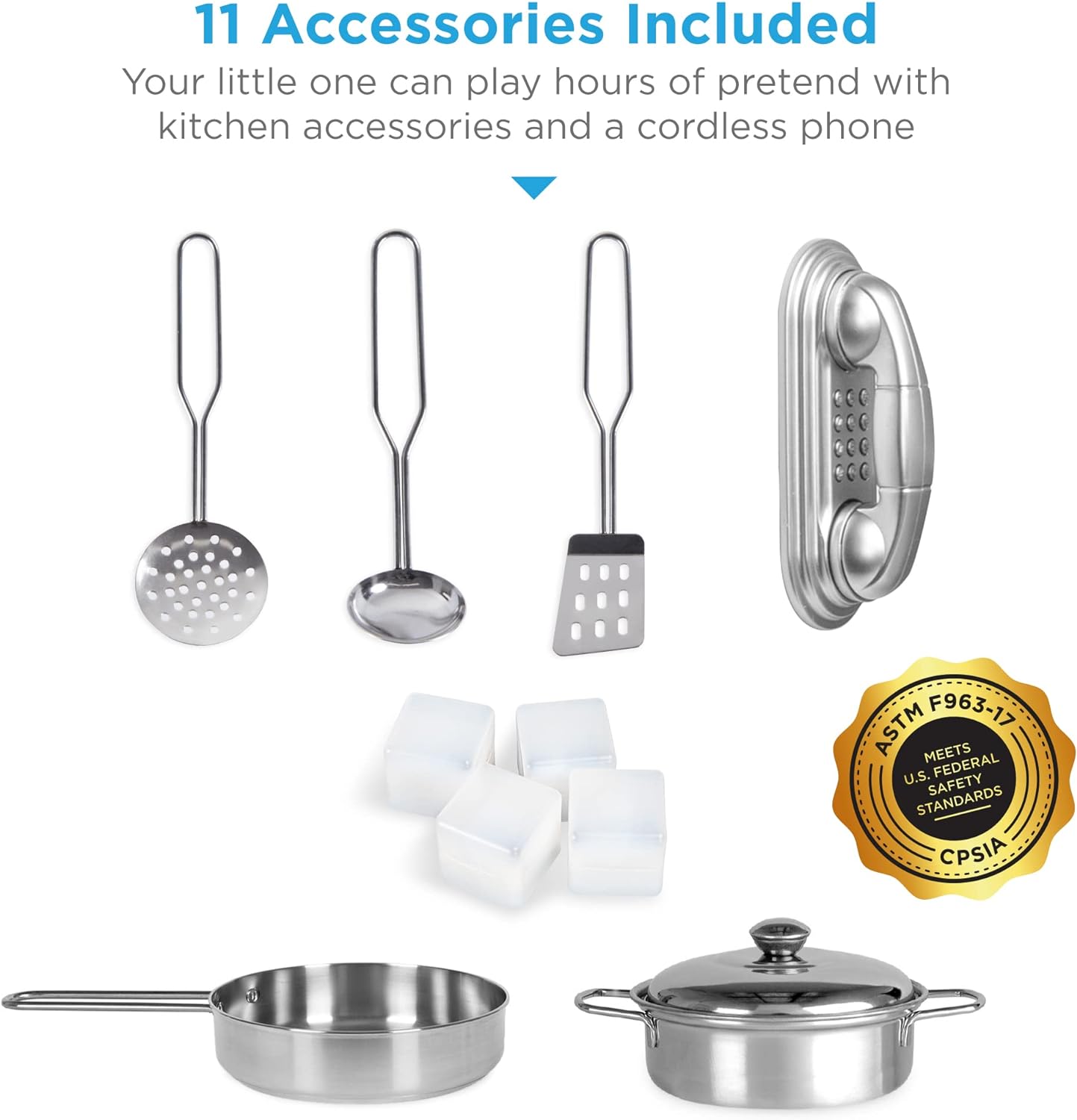 - 11 ACCESSORIES INCLUDED: Set includes 3 utensils. 2 pots. one lid to play with and kitchen comes with an ice maker that dispenses ice cubes (4). and even a cordless phone; keep the accessories in the 20.25 sq. in overhead shelf. the 110 sq. in. oven. or in the fridge. freezer. microwave. and dishwasher