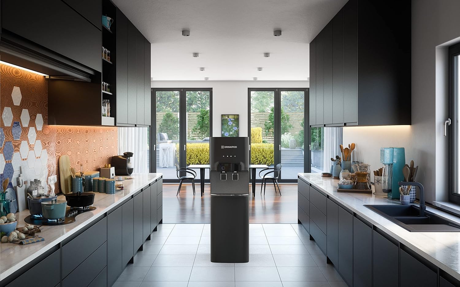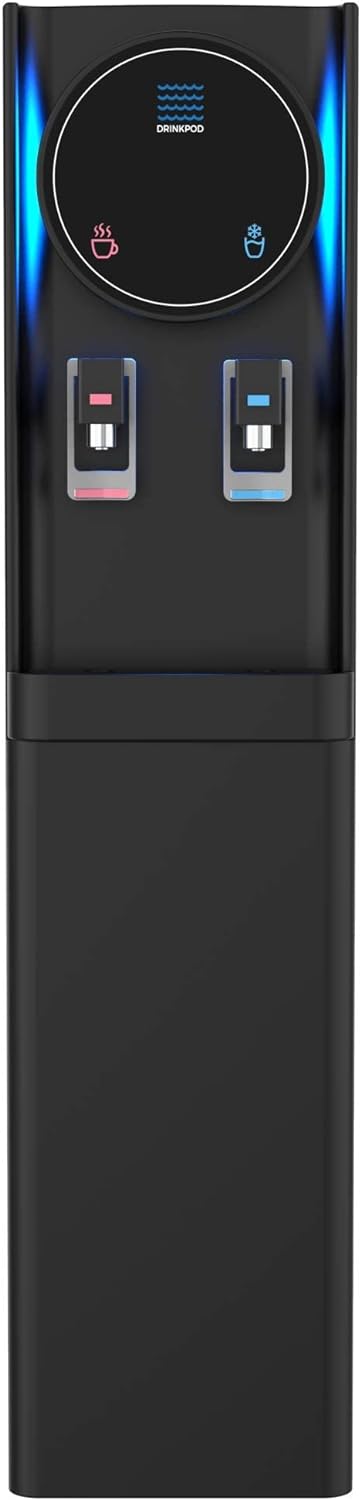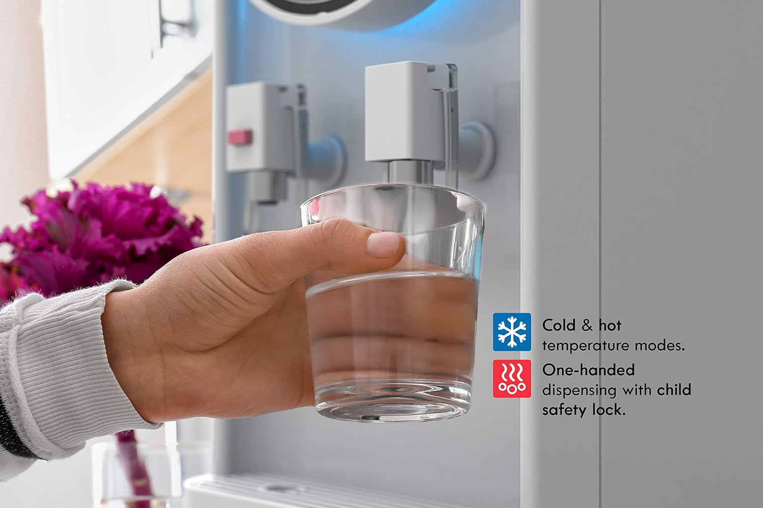 - UPGRADE YOUR KITCHEN DÉCOR: This sleek water cooler system with the unique Blue LED Accent Light will add elegance to your home kitchen or office. No more bulky water cooler dispensers or space consuming 5 gallon water bottles.
