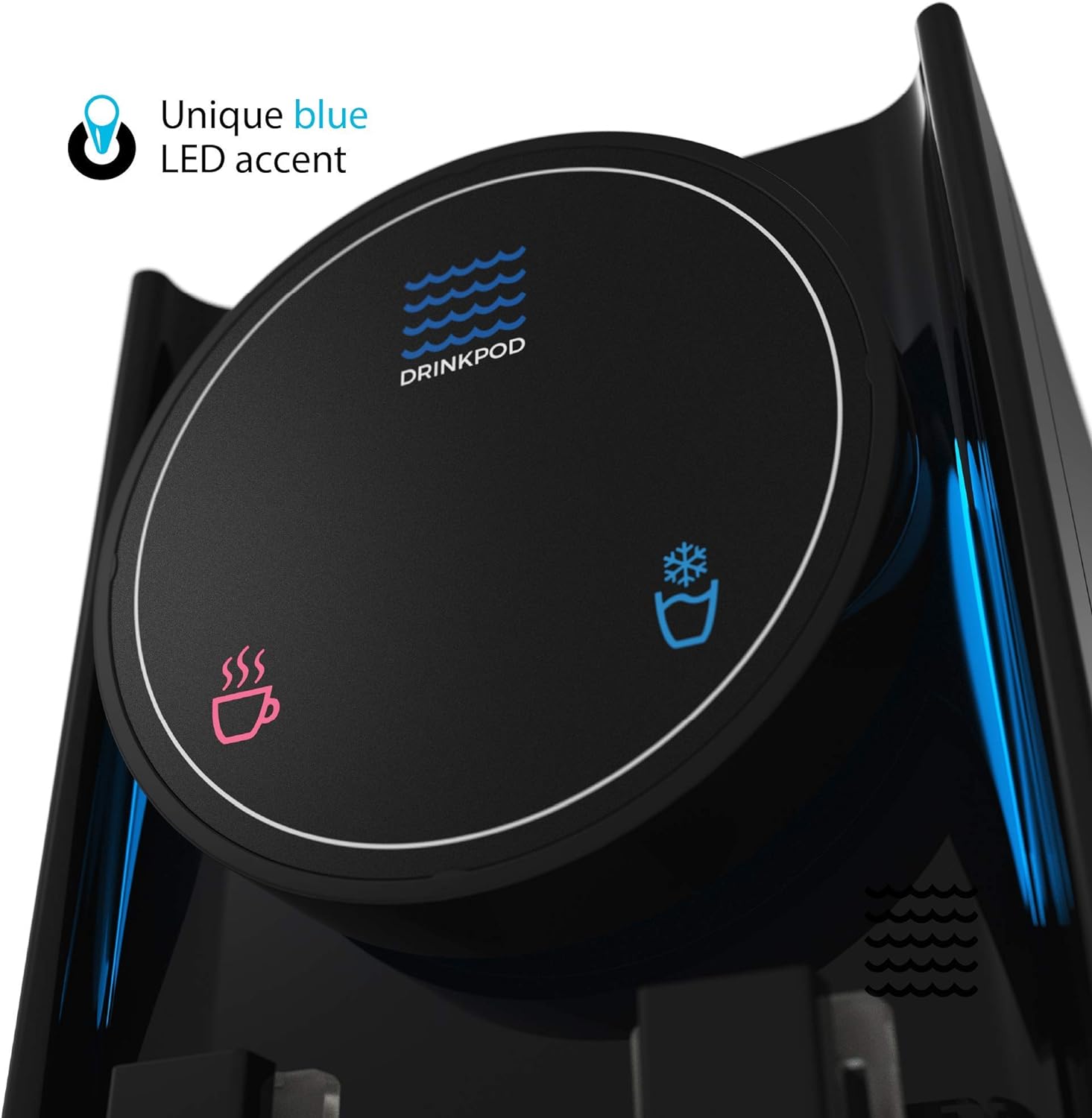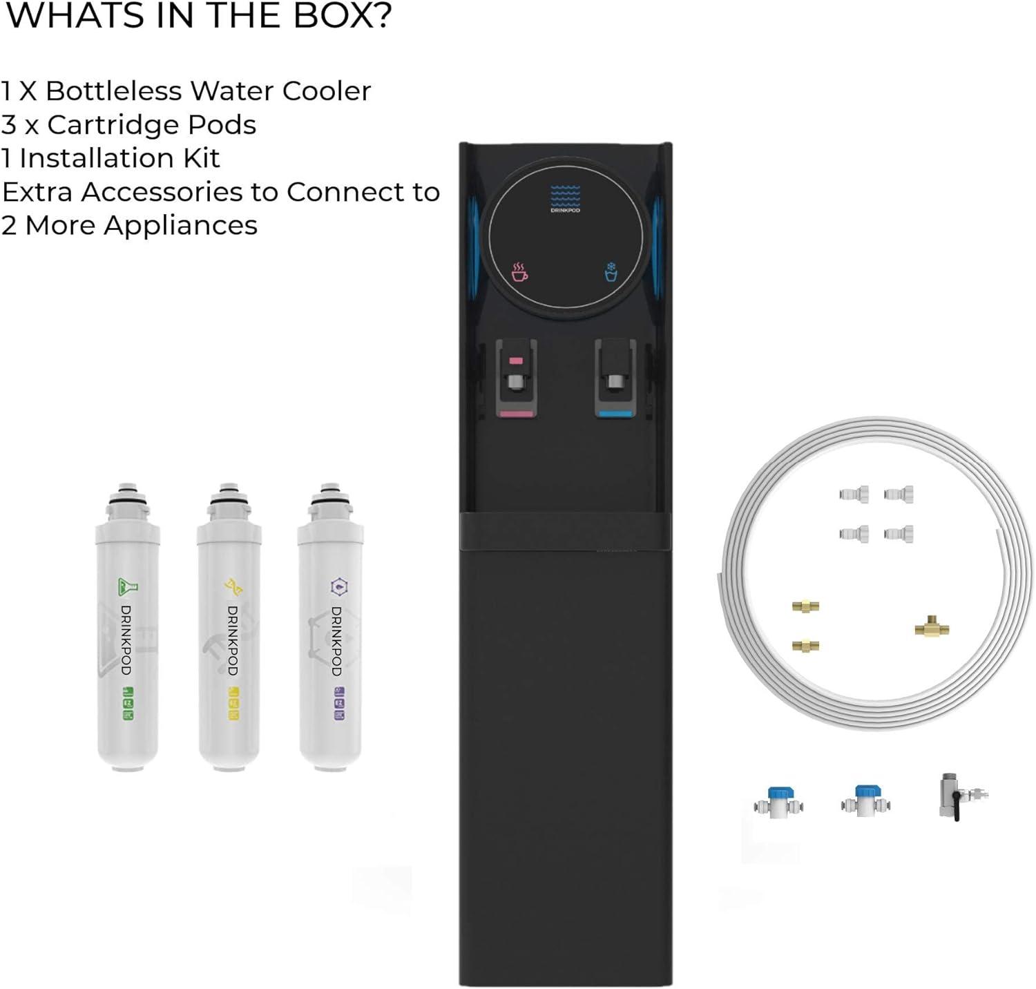 The Drinkpod 6 Series Bottleless Water Cooler Dispenser is slim and attractive and features a unique blue led accent light. that will add a beautiful touch to any home or office setting. With two independent temperature modes. this water cooler is outfitted to meet and exceed all your drinking needs. From a piping hot cup of Chai tea. or a crisp refreshing glass of chilled delicious water. every drop from the water cooler dispenser will leave you wanting more. The Drinkpod Pro Series 6 Water Cooler connects to an existing water line to supply delicious fresh pristine water though its ULTRA +3 Pod technology contained inside a magnetic door in the water cooler dispenser A complete installation kit is included with a detailed easy to read manual and illustrations to get you set up in less than 30 minutes. The Drinkpod Bottleless Water Cooler is also equipped with a bonus Ice/Café Connect and can provide refreshing delicious water for up to 2 additional appliances like your ice-maker and coffeemaker. Dimensions: 10.24 W x 17.72 L x 43.7 H