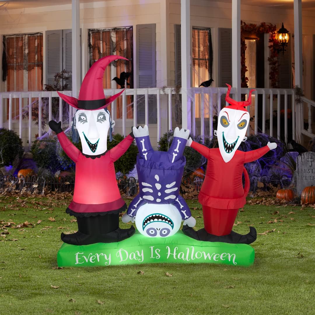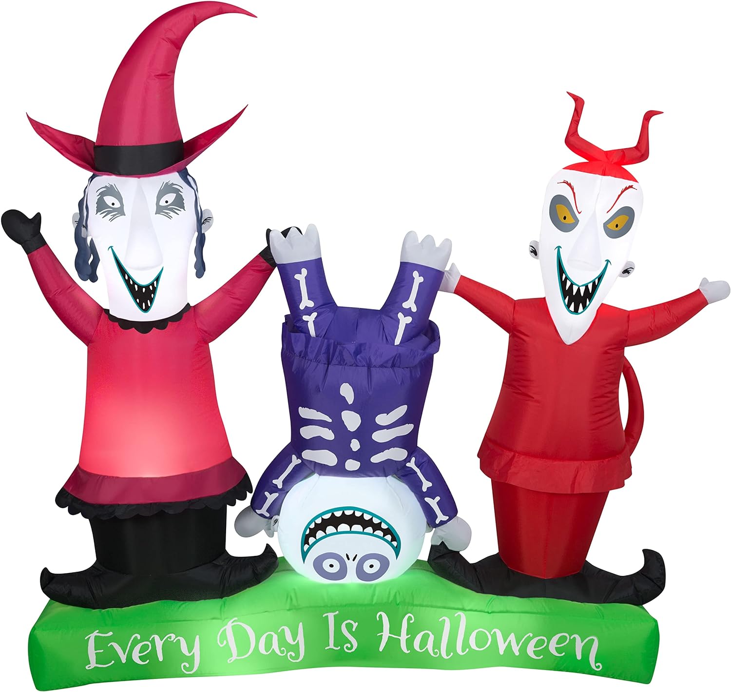 Make your Halloween extra spooky with a triple threat from The Nightmare Before Christmas. This eerie Airblown Inflatable features Lock. Shock and Barrel. the Boogie Boys from Tim Burton's classic film on a "Every Day Is Halloween" base. Setup is super simple. Just plug it in. stake it down and watch the magic unfold. Display this Disney Halloween decoration as a standalone or combine it with other Airblown Inflatables to create a custom scene.