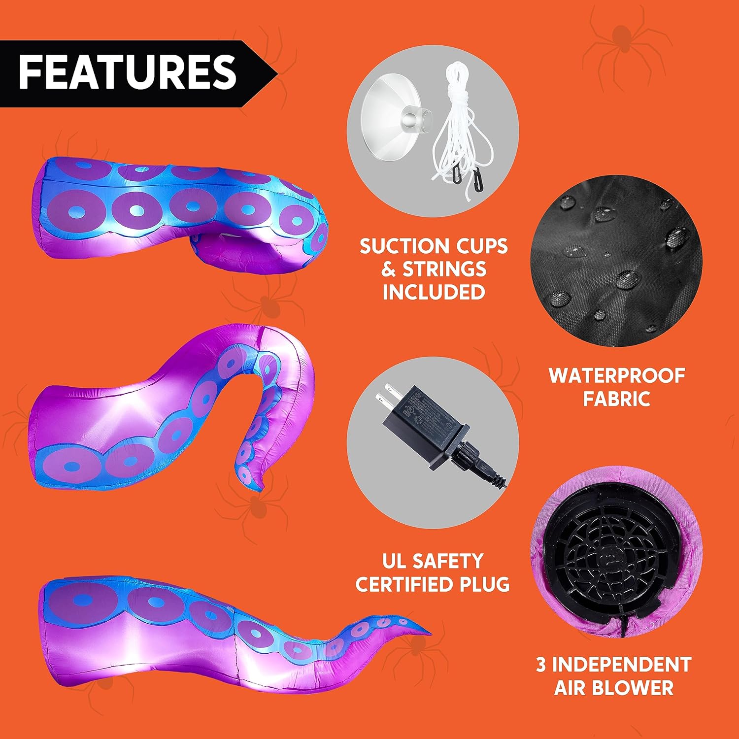 - Perfect Design. This Halloween inflatable octopus tentacle decoration has stunning visual effects. making it an unmissable centerpiece for your Halloween party. Including 4.5 ft. 5 ft. 6 ft long large tentacles. This inflatable comes with an extended cord.suction cups. fastened ropes. and a plug with UL certification.
