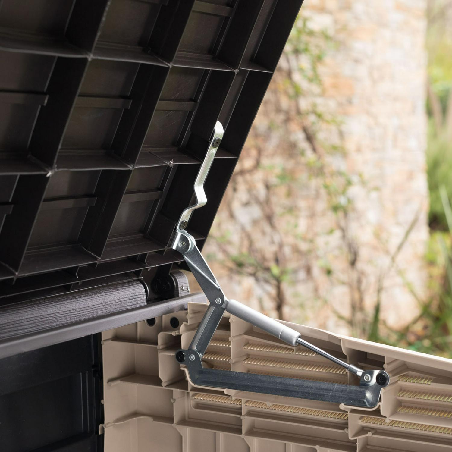 - Includes bin-opening kit that raises trash bin lids when storage unit top is lifted