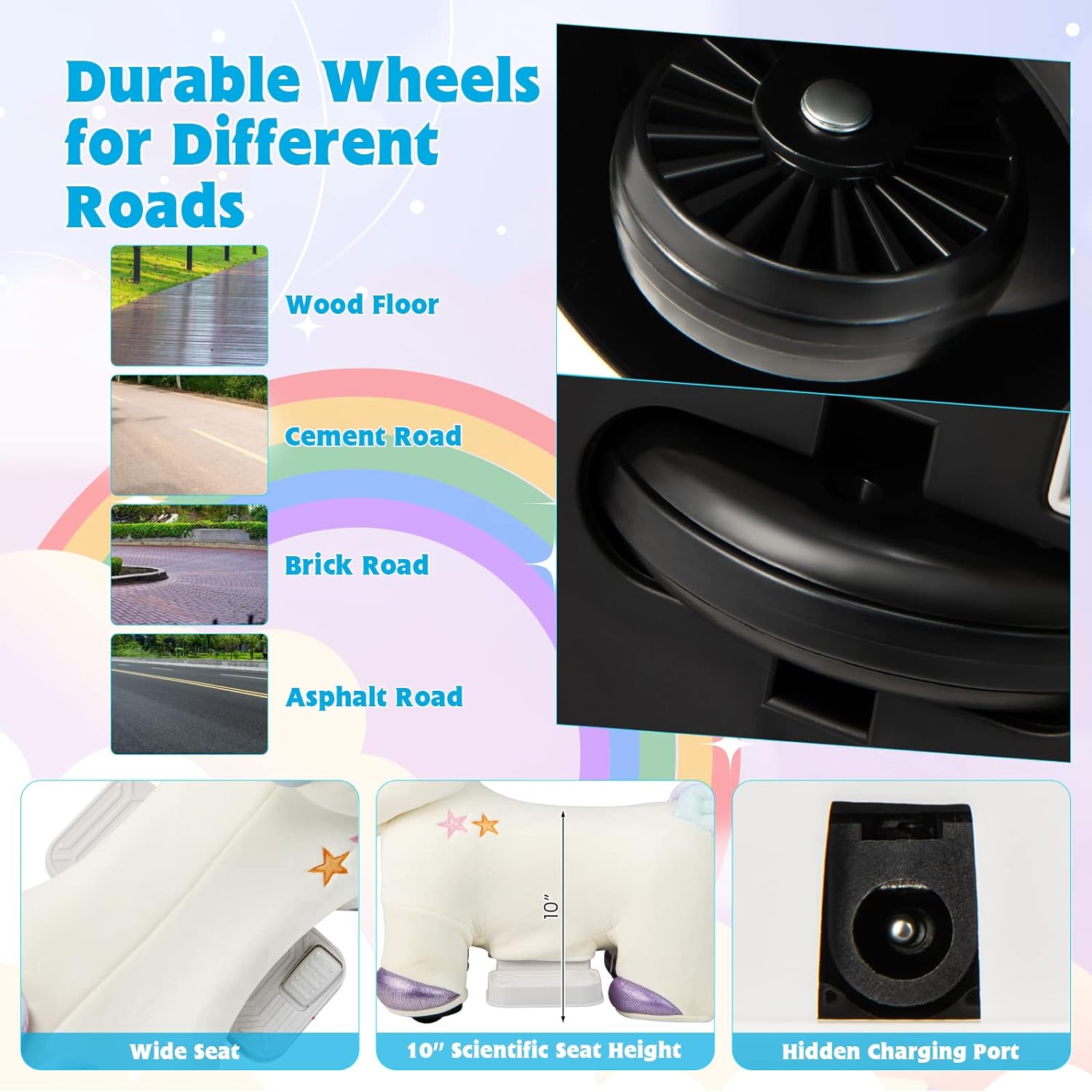- More Child-friendly Design: The wide seat supports kid’s body perfectly. Foot-to-floor design allows kids to exercise leg muscles. When toddlers feel tired. they can place their feet on the footrests. Meanwhile. the hidden charging port ensures convenient charging after play.