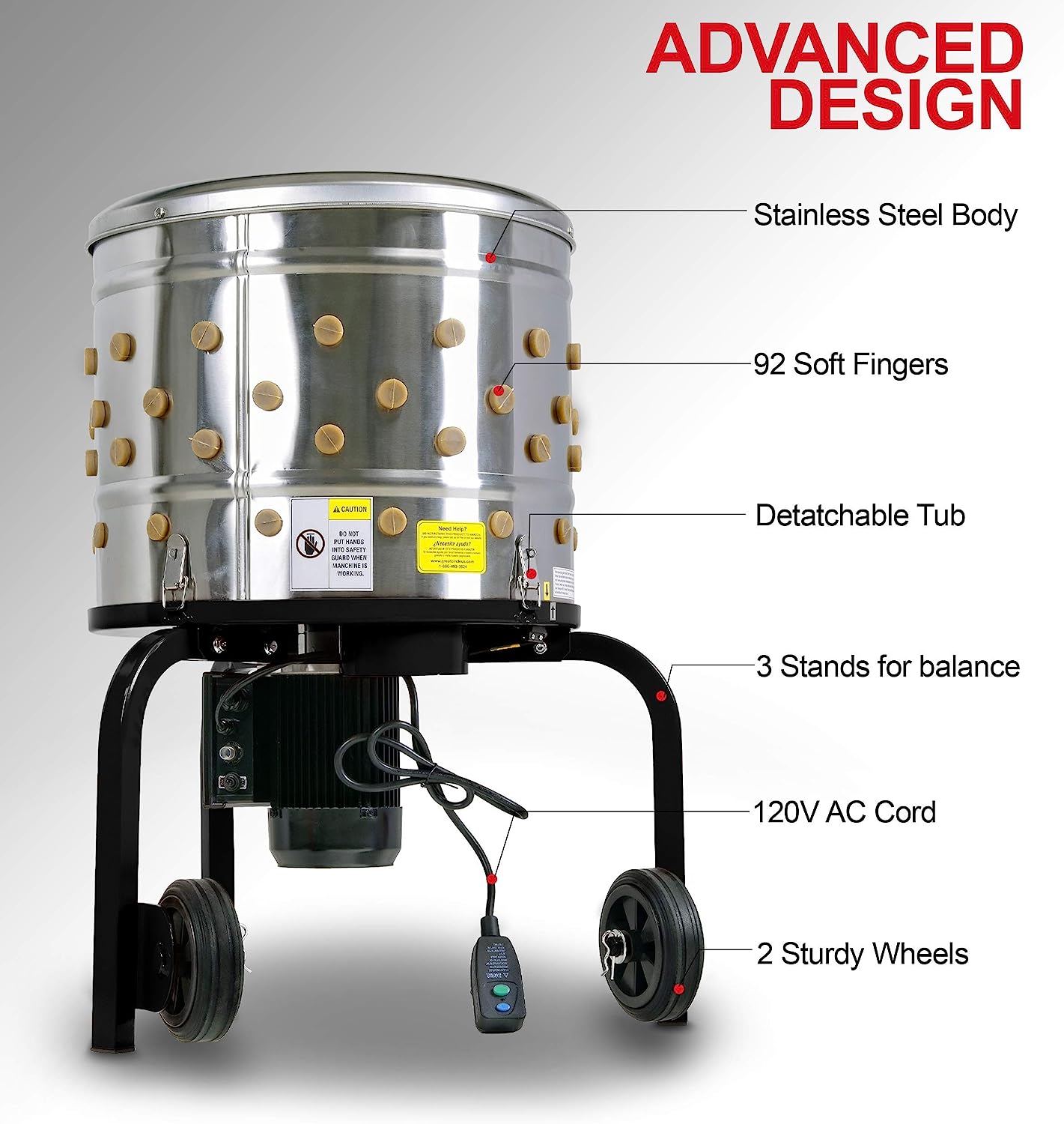 - ADVANCE DESIGN; Our Plucker has a robust compact design for easy storage and transportation. including 2 wheels for optimal maneuverability; Built of premium safe and sanitary 403 Brushed Stainless Steel body/base (protecting from rust)