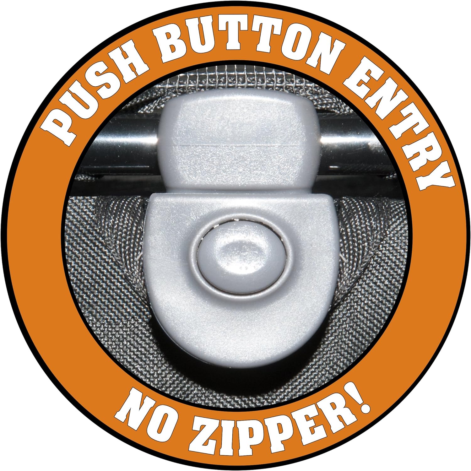 - Push button easy-locking. NO-ZIP entry; 600 Denier water-resistant material; top and front mesh windows for ventilation