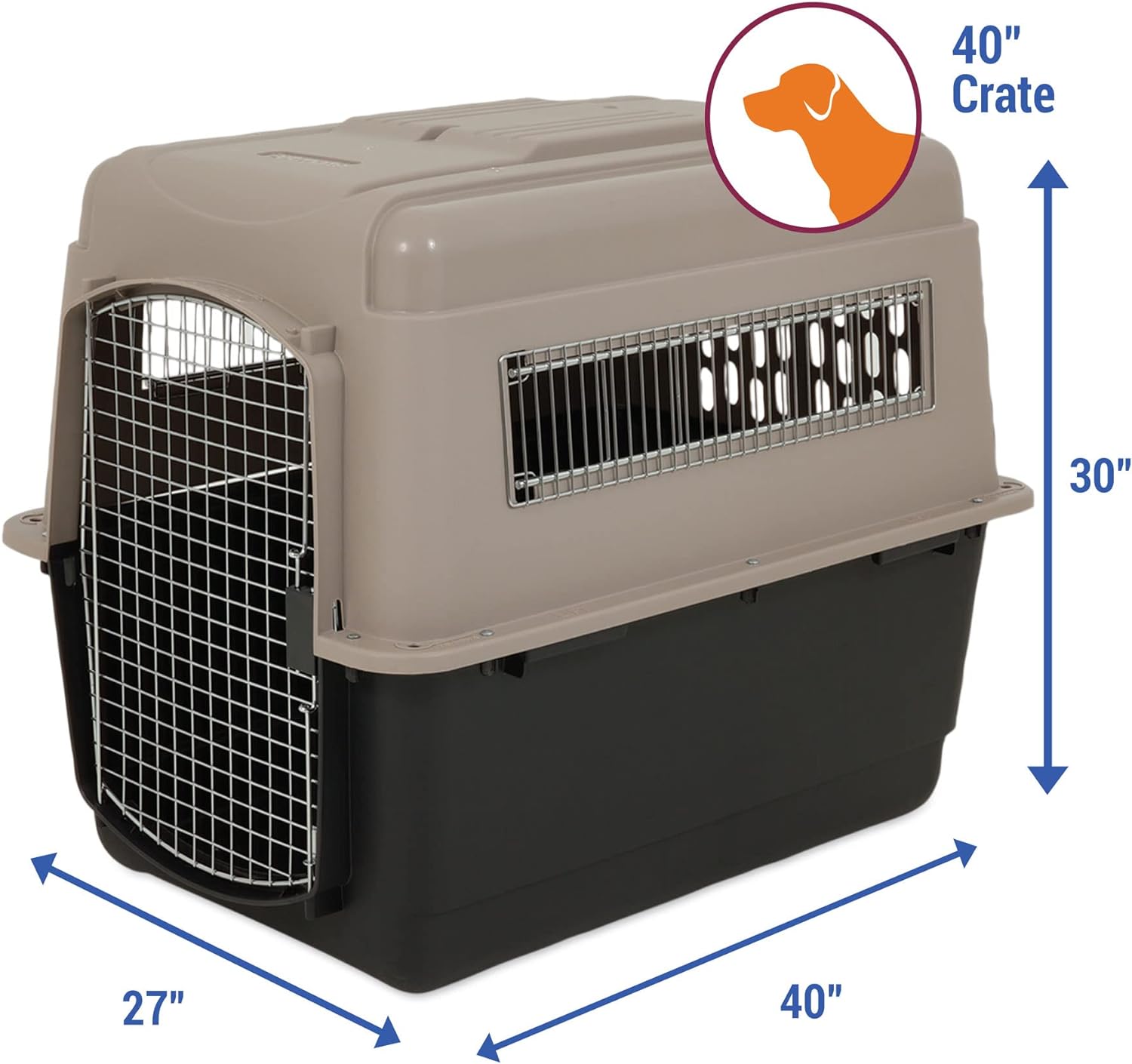 - DOG AIR TRAVEL KENNEL: This large dog travel kennel features tie-down strap holes. wire vents for ventilation & a raised interior to keep pets safe and comfortable. For medium dogs 90-125 lbs. Measures: 48"