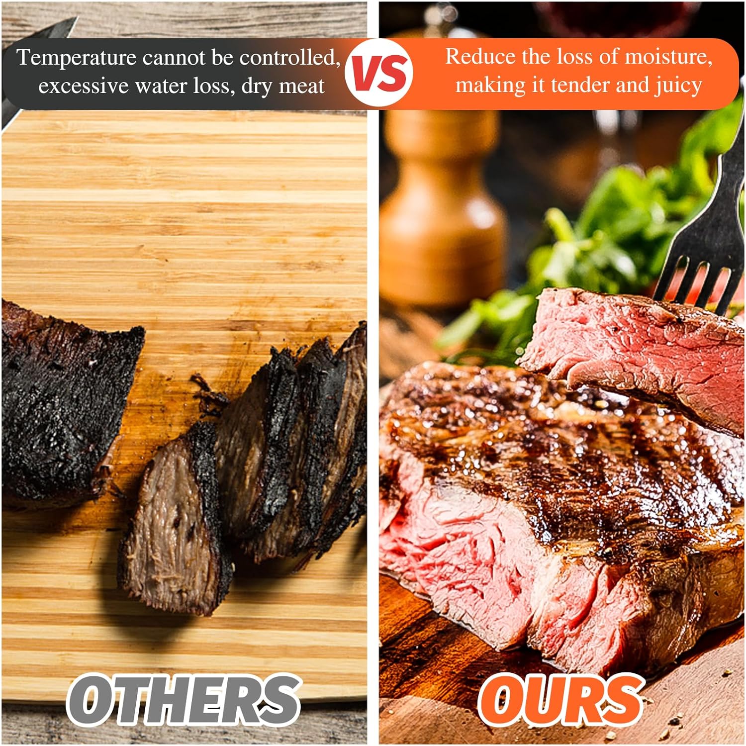 - 【Premium Features】: LCD screen and meat probe to show grill temperature and probe temperature (free Meat Probe included). Large capacity hopper can accommodate 5lbs wood pellets. It also can be run from a small car power inverter. The combination of superheated steam and pellet grilling enables you to create tender and juicy wood-fired flavor roasts.