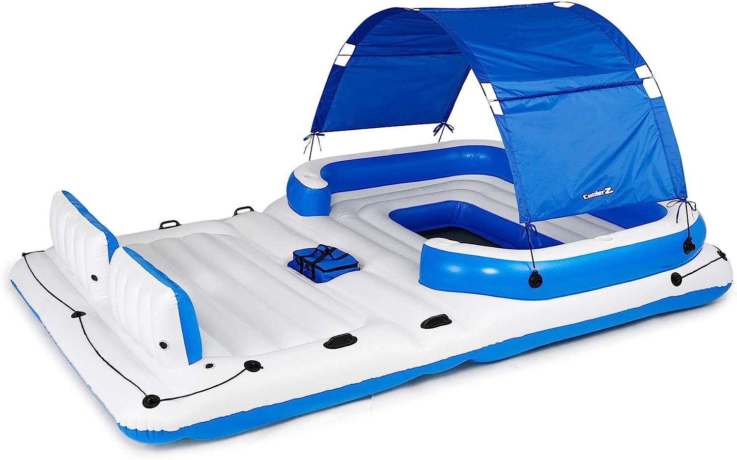 Floating island with premium features such as removable sunshades. cooler bags and heavy-duty repair patches