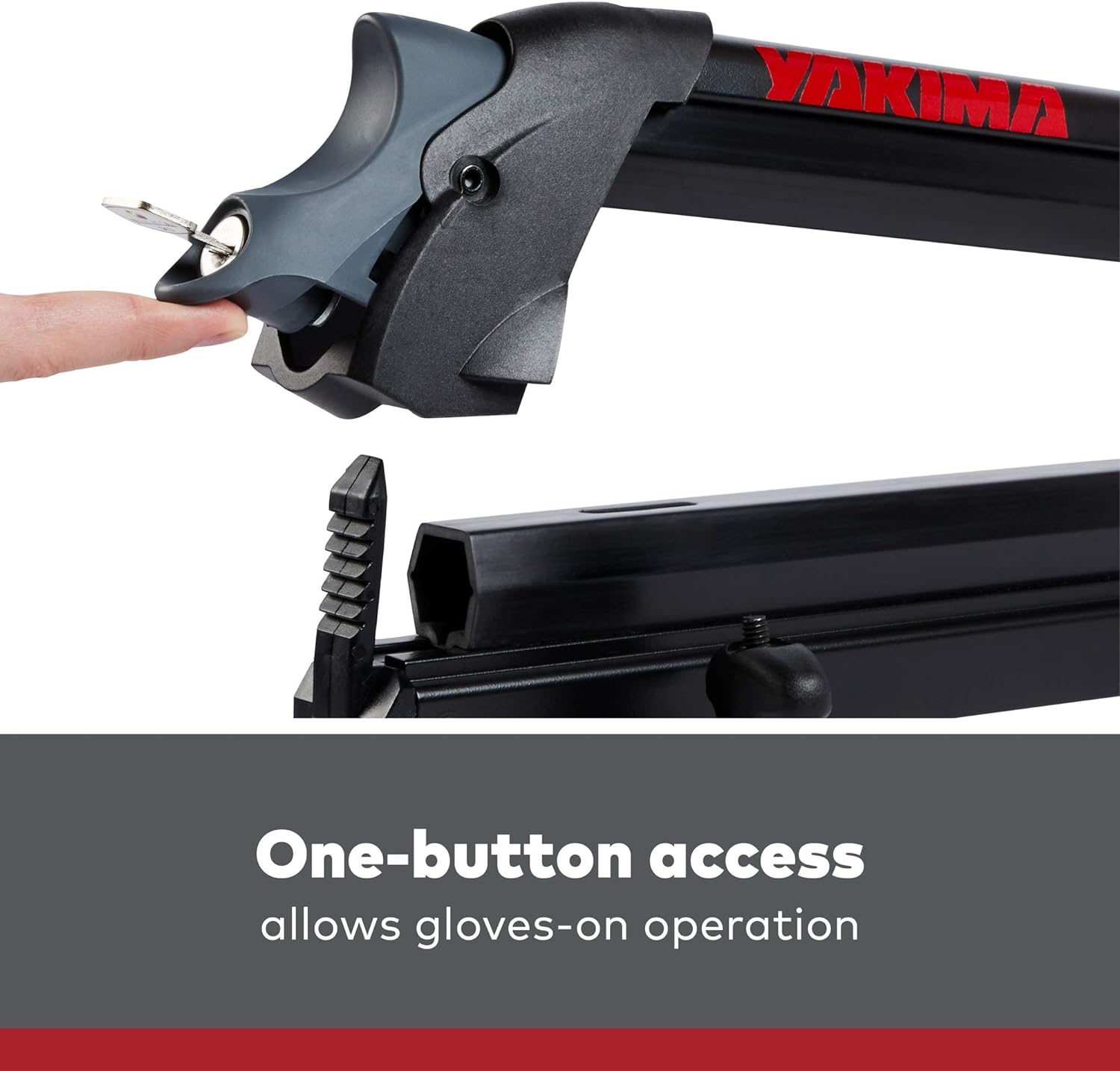 The game-changing Yakima PowderHound 6 Snow Rack is a gift to yourself. your gear and your car. This stylish rack fits on just about any crossbar and is wide enough to carry up to 6 pairs of skis (96mm wide at Tips) or 4 snowboards. It features one-button access so you can load or grab your gear with gloves on. and SKS Lock Cores to keep it all safe. Setting up the PowderHound 6 is easy and requires no drilling or powertools—just a hex wrench that comes with the rack.